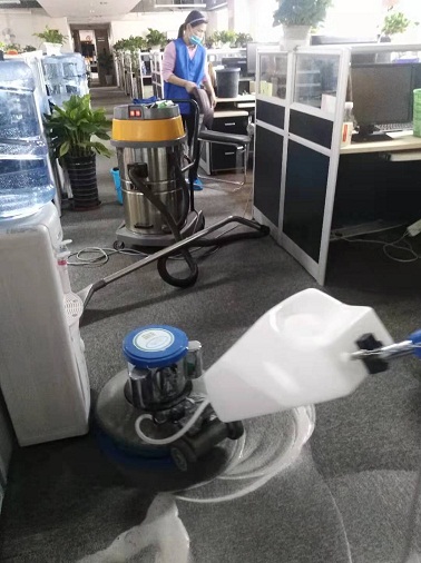操作方法: 1、用吸塵器對地毯進行全面吸塵,除去表層可吸附垃圾 2、局部處理即是用專用的清潔劑在地毯上邊油漬、果漬、咖啡漬單獨進行處理 3、稀釋地毯泡沫清潔劑,注入打泡箱 4、用手刷處理地毯邊緣、角落和機器推到之處 5、用裝有打泡器、地毯刷的單盤掃地機,以干泡刷洗地毯